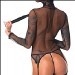 Ensemble extravagant en résille noire composé d'un porte-jarretelles avec cagoule, d'un petit string et d'un collier avec mini-fouet. La résille élastique s'adapte à la peau de manière douce et confortable. Le collier choker réglable et le flogger amovible de 34 cm de long sont fabriqués en similicuir stylé. La guêpière à manches longues est équipé de jarretelles élastiques et de sangles pour les cuisses, chacune étant réglable de manière adaptée. La cagoule a des ouvertures pour les yeux et la bouche solidement cousues. Le petit string en résille complète le look transparent excitant.