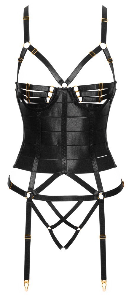 Ensemble corset porte-jarretelles noir et string ouvert de Cottelli LINGERIE. Design élégant et détaillé composé de bandes élastiques et de lanières stretch dans une optique satinée noble avec des accessoires dorés. Entièrement doux et souple pour un confort de port optimal. Corsage avec baleines intégrées et fermeture à crochets réglable dans le dos. Les bretelles reliées à l'arrière par un crochet, les nombreuses lanières de bonnets et les jarretelles sont réglables pour un ajustement absolument parfait. Le string à lanières est ouvert (pas seulement) à l'entrejambe, ce qui est très excitant.