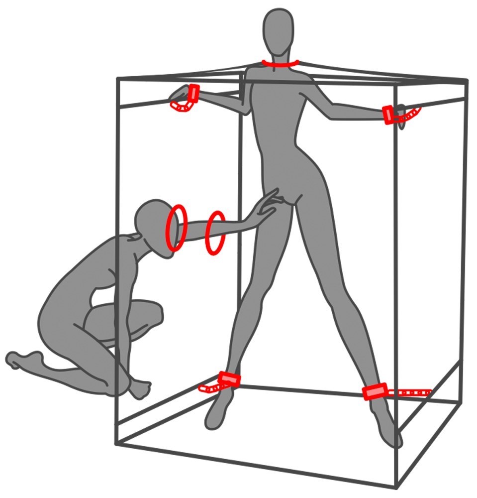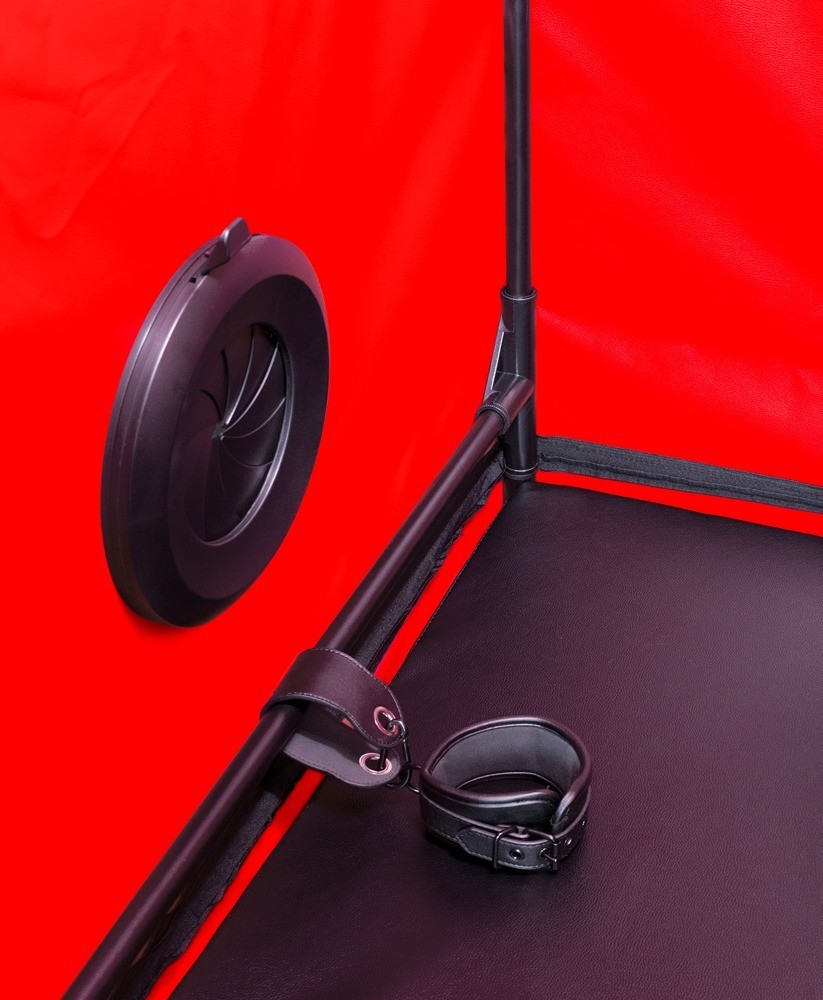 cabine BDSM Scandale de Secret Dome est idéale pour les jeux de glory hole, les jeux d'obscurité, les jeux de rôle captivants et autres fantasmes. Grâce à son système de tubes modulaires et sa toile opaque et robuste, cette cabine solide est rapide à monter et prête à l'emploi. L'ouverture pour la tête est équipée d'une fermeture éclair et d'une large menotte ajustable. Neuf grandes ouvertures (trois de chaque côté) peuvent être complètement fermées par des panneaux. L'entrée se fait facilement par une porte latérale zippée. Deux ventilateurs et un éclairage LED assurent une ventilation et un éclairage optimaux dans cette cabine plongée dans l'obscurité. Un tapis de sol moelleux offre un confort supplémentaire. Les menottes et les entraves incluses (une paire de chaque) peuvent être positionnées à l'intérieur selon vos envies. Les menottes rembourrées sont faciles et rapides à mettre et à ajuster grâce à leurs boucles.