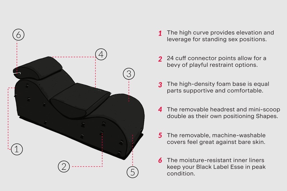 Le fauteuil de bondage ergonomique Black Label Esse de Liberator vous invite à savourer des jeux érotiques tout en douceur et en confort. Il comprend des menottes pour les mains et les pieds, des sangles, des connecteurs et un masque pour les yeux. Les surfaces latérales sont recouvertes d'un Velcro doux, permettant de fixer les éléments de bondage de manière flexible et sécurisée, selon vos envies et vos fantasmes. Grâce à ses fermetures pratiques à clic et Velcro, les menottes et les sangles s'enfilent, s'ajustent et se retirent facilement et rapidement, pour un confort optimal et une grande liberté de jeu.