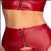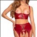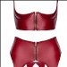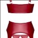 Un ensemble à entrejambe ouverte composé d'un soutien-gorge bustier, d'un string ouvert et d'un porte-jarretelles à lanières tour de cuisse. L'élégant tissu bordeaux mat est subtilement rehaussé d'anneaux et de fermetures éclair dorés. Doux et extensible pour un confort exceptionnel. Le soutien-gorge et le porte-jarretelles sont tous deux avec d'une fermeture éclair décorative sur toute la longueur du devant. Le soutien-gorge, à la coupe plus longue et aux bonnets légèrement rembourrés avec armatures, galbe parfaitement la poitrine. Les bretelles sont réglables pour un ajustement parfait. Le porte-jarretelles avec ses lanières cuisse fixes sont aussi réglables. Le string est entièrement ouvert à l'entrejambe.
