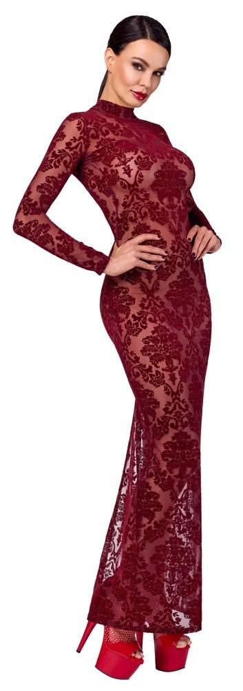La robe Kink Royal de Noir est une robe longue cintrée à manches longues, arrivant aux chevilles, d'une transparence bordeaux à couper le souffle, ornée d'un imprimé floqué velouté. Extensible et souple, elle offre un confort exceptionnel et une grande liberté de mouvement. Le dos présente un décolleté généreux et un élégant col montant fermé par un crochet. La fente extra-haute au dos de cette robe moulante assure une liberté de mouvement optimale et crée une silhouette séduisante.