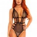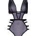 Body string en résille avec ouvertures sur les hanches et sur les côtés du buste parcourus de brides élastiques.