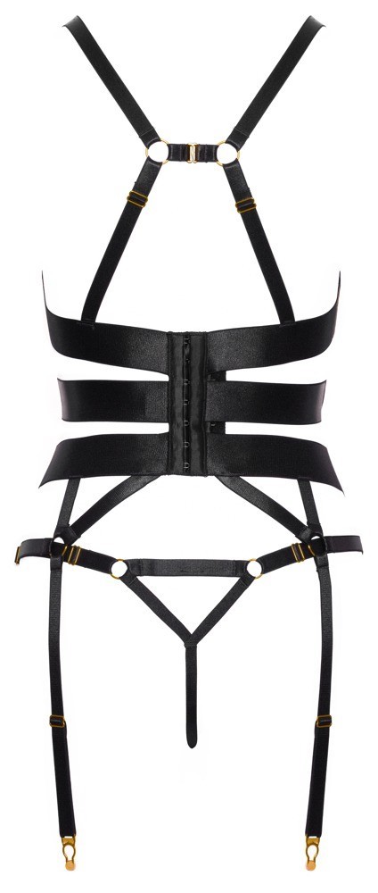 Ensemble corset porte-jarretelles noir et string ouvert de Cottelli LINGERIE. Design élégant et détaillé composé de bandes élastiques et de lanières stretch dans une optique satinée noble avec des accessoires dorés. Entièrement doux et souple pour un confort de port optimal. Corsage avec baleines intégrées et fermeture à crochets réglable dans le dos. Les bretelles reliées à l'arrière par un crochet, les nombreuses lanières de bonnets et les jarretelles sont réglables pour un ajustement absolument parfait. Le string à lanières est ouvert (pas seulement) à l'entrejambe, ce qui est très excitant.