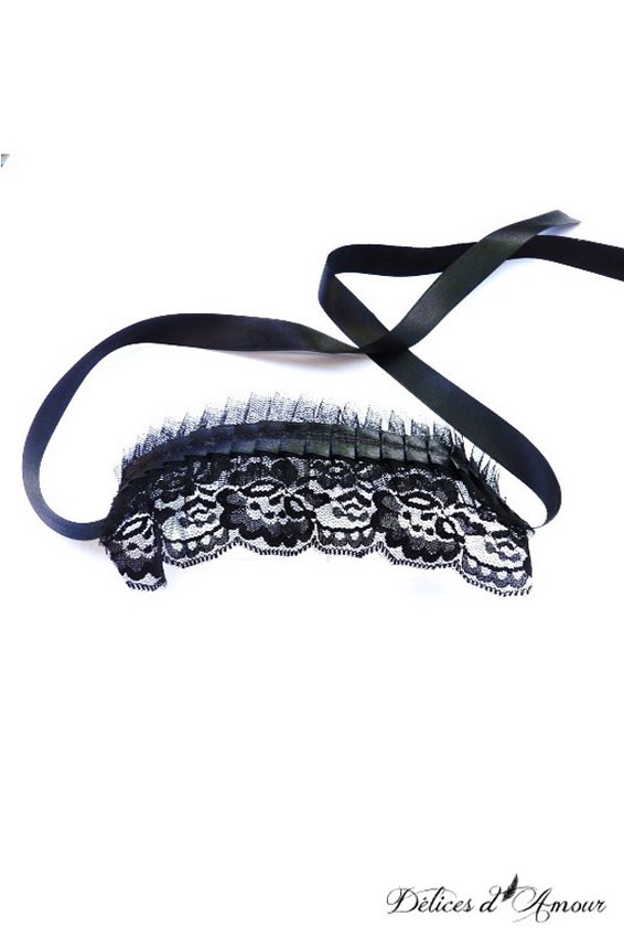 Superbe masque conçu dans une dentelle florale délicate et très chic. Du satin plissé superposé se rabat sur le haut du masque ré-haussé d'Organza. Les liens satin mesurent chacun 50cm.