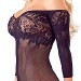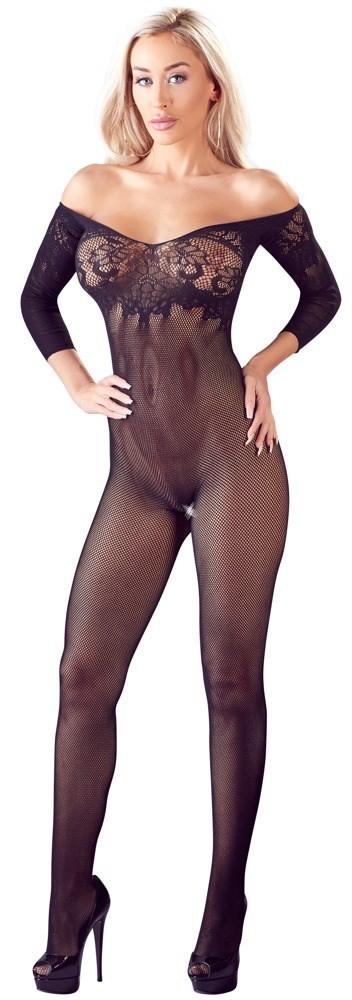 Combinaison noire en résille aux épaules tombantes et ouverte à l'entrejambe
