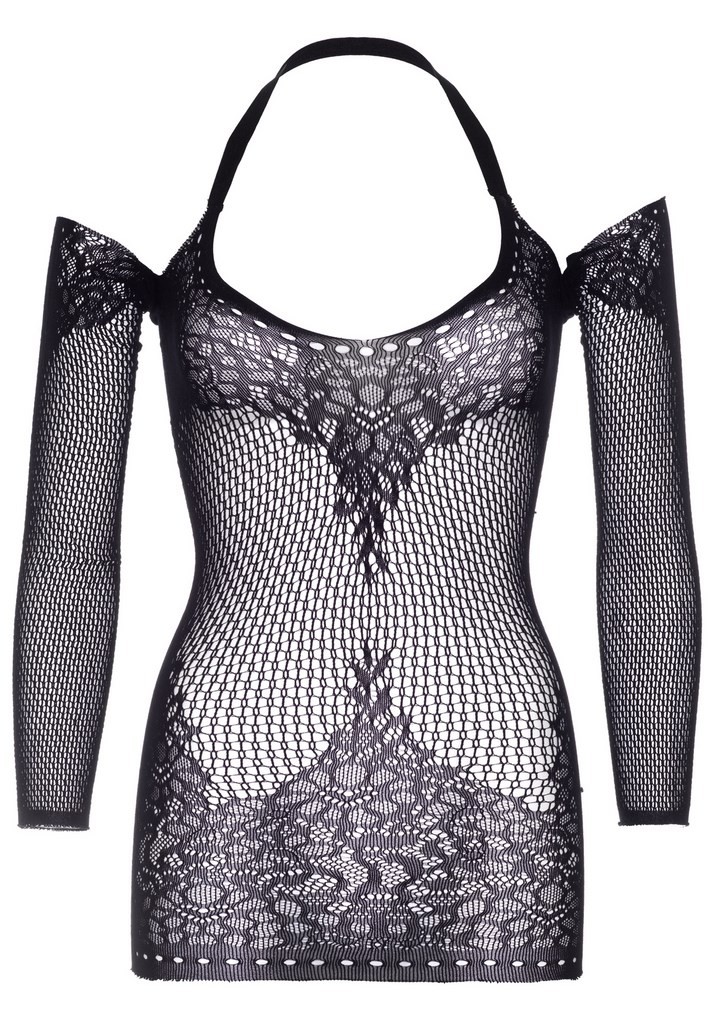 Robe noire en dentelle florale et crochetée aux épaules et dos nus aux manches longues