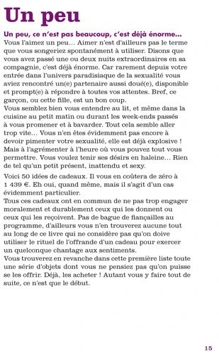 Tout peut être offert. Attendez-vous à des surprises, qui mettront du piquant dans votre vie amoureuse. Classée par degré de sensualité, chaque proposition est assortie du budget requis et de suggestions de lieux où se procurer le cadeau.
