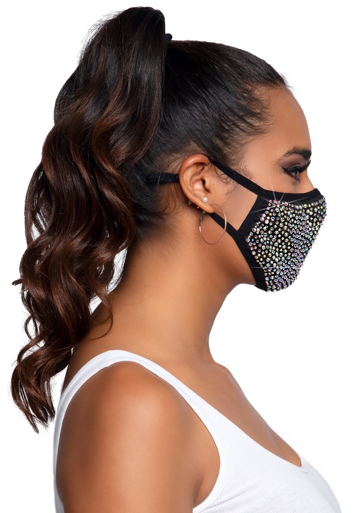 Masque réutilisable avec une multitude de strass doté de lanières ajustables pour les oreilles pour un meilleur confort.