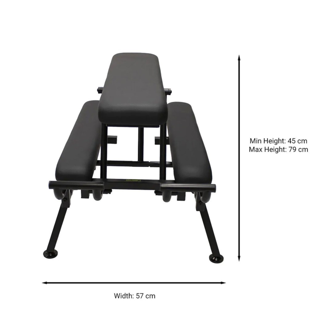 Deux tiges en acier réglables situées sous la selle permettent de modifier facilement la hauteur et l’inclinaison. Il suffit de positionner les écrous papillon dans les encoches prévues, de les serrer solidement, et le banc reste parfaitement stable pendant l’utilisation. Une fois le réglage effectué, l’utilisateur peut s’installer confortablement, saisir le guidon de maintien et profiter d’un soutien optimal.