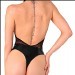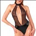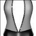 Body string noir exclusif de Noir wetlook combiné à un fin filet transparent. Epaules et dos nus, col montant et tour de cou à boutonner. Le décolleté profond à l'avant est somptueusement bordé d'une bande de pierres scintillantes. Les découpes extra hautes pour les jambes mettent parfaitement en valeur les fesses et les jambes. Le mélange de matières élastiques sur tout le pourtour s'adapte en douceur et offre un confort de port maximal.