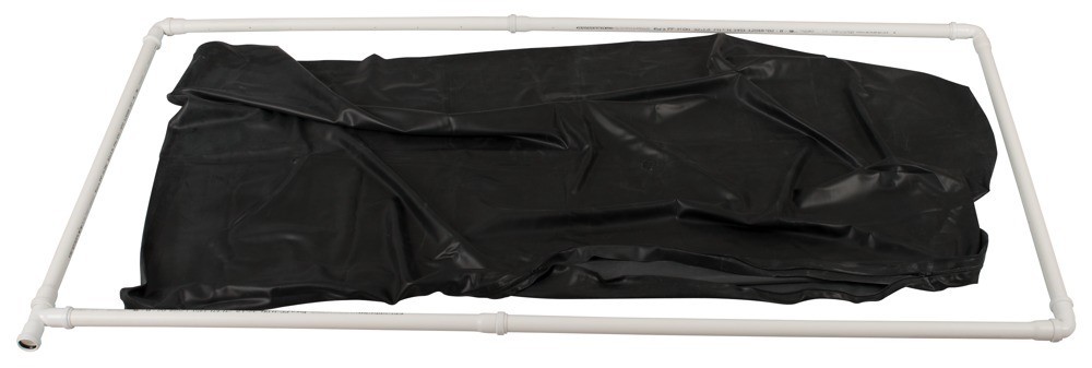 Lit à vide en latex noir de 1 x 2 mètres. Inclut des tubes en plastique pour le montage et un court tube en T pour pouvoir faire le vide avec un aspirateur (l'aspirateur doit rester branché). Longue fermeture éclair sur le côté. Avec deux ouvertures : l'une à hauteur de visage, sur laquelle on peut fixer un tuyau quelconque pour respirer, et une autre ouverture au milieu.