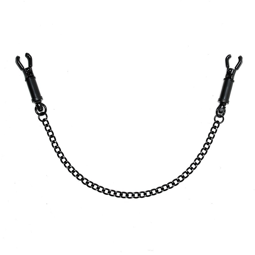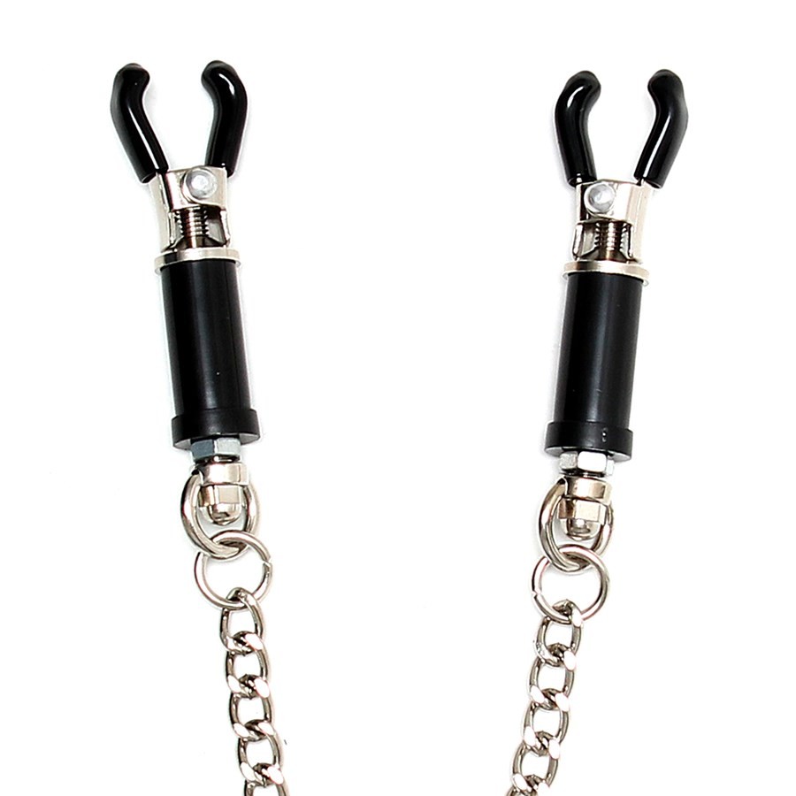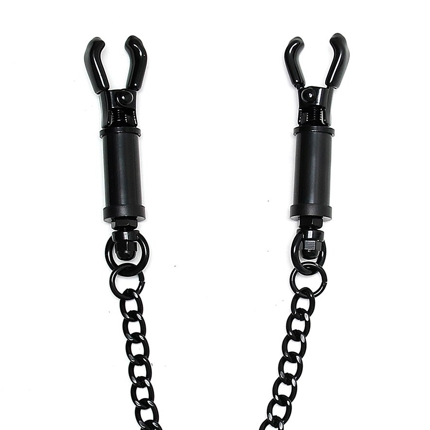 . Pinces à seins avec vis permettant le réglage du pincement du téton. Métal noir et argenté