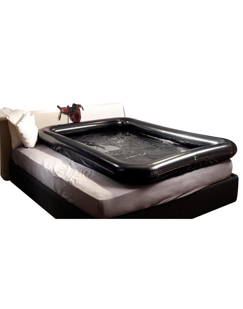 Drap en vinyle noir avec le bord gonflable transformant un lit en une surface de jeux lisse et brillante pour des massages érotiques