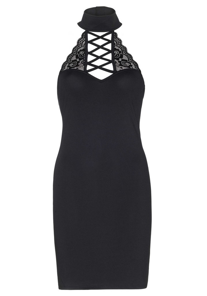 Robe noire moulante en élasthanne au col tour de cou en dentelle