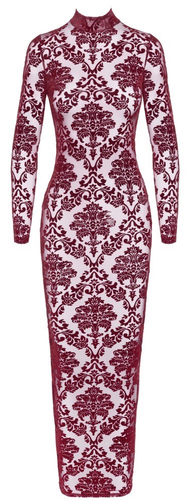 La robe Kink Royal de Noir est une robe longue cintrée à manches longues, arrivant aux chevilles, d'une transparence bordeaux à couper le souffle, ornée d'un imprimé floqué velouté. Extensible et souple, elle offre un confort exceptionnel et une grande liberté de mouvement. Le dos présente un décolleté généreux et un élégant col montant fermé par un crochet. La fente extra-haute au dos de cette robe moulante assure une liberté de mouvement optimale et crée une silhouette séduisante.